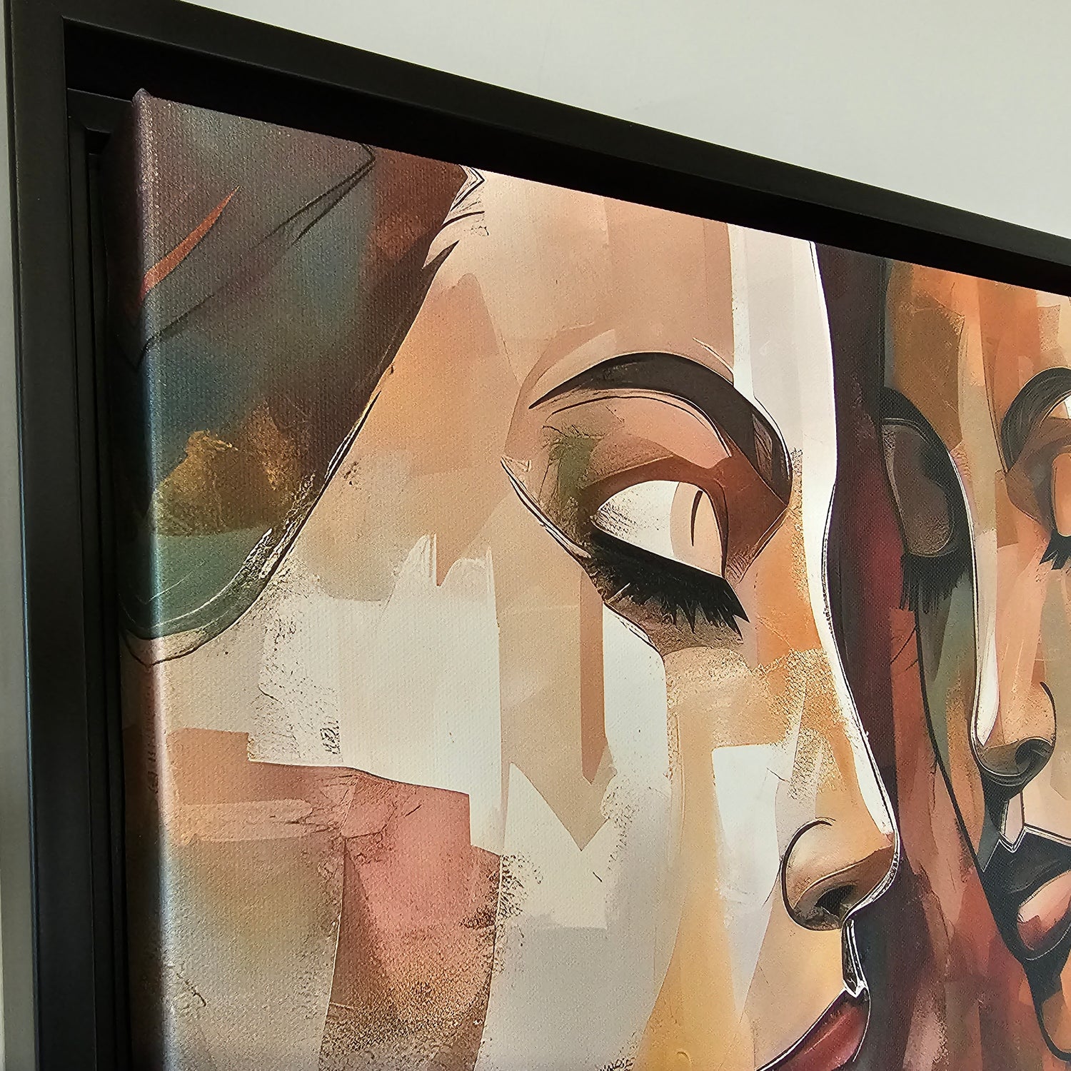 This mesmerizing digital artwork spotlights three women adorned in vibrant, colorful dresses, each one bringing a unique elegance to the piece. The structured abstraction style gives way to a delicate blend of light pink, amber, light orange, and soft blacks. Symmetrical figures are presented in a soft focus, creating a sense of harmony and human connection. This print is perfect for adding a touch of feminine charm and warmth to any interior space.